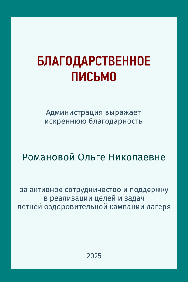 За активное сотрудничество и поддержку в реализации целей и задач летней оздоровительной кампании лагеря.